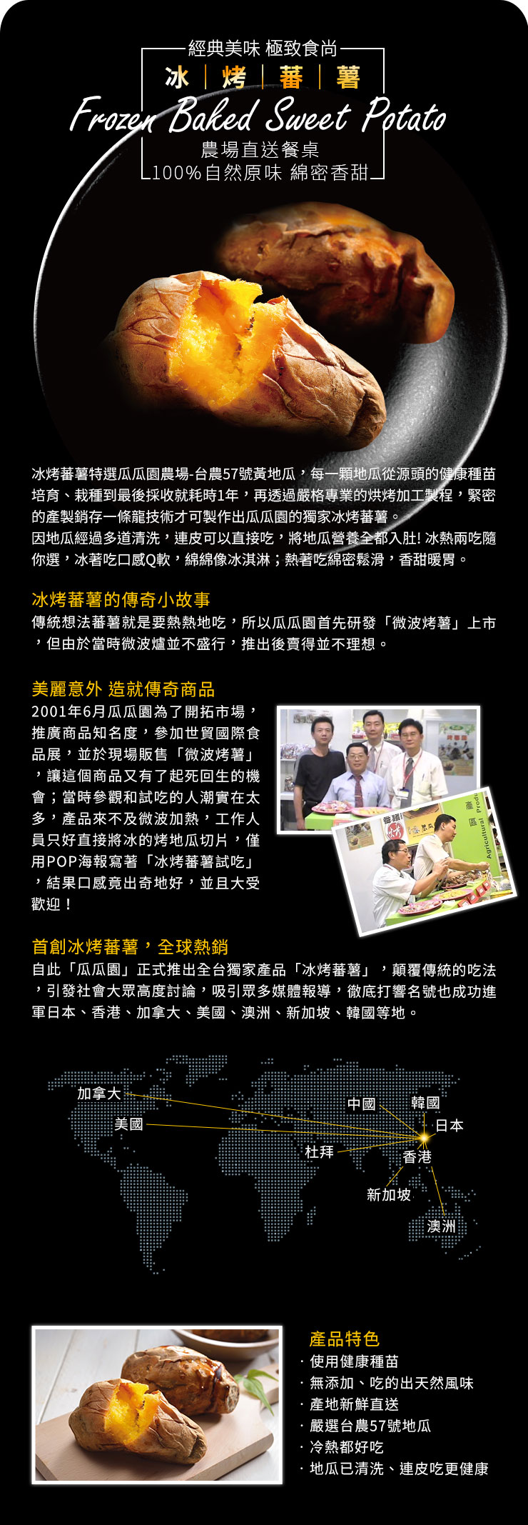 嚴選瓜瓜園農場優質台農57號黃地瓜,從種植端的健康種苗培育、栽種、專業採收部門、原料妥善儲存分級完全、清洗與妥善包裝,再透過嚴格專業的控管烘烤加工製程,緊密的產製銷存一條龍技術才可製作出瓜瓜園獨家冰烤蕃薯。